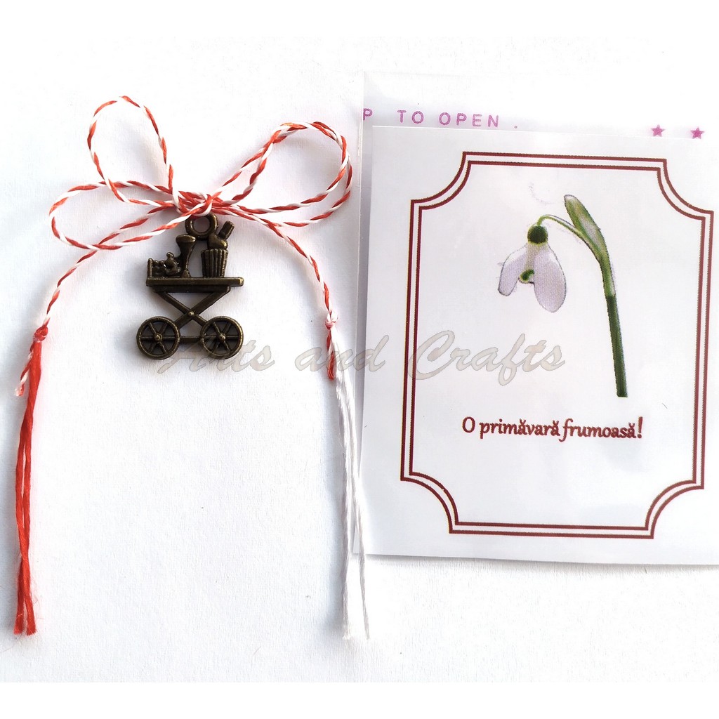 Martisor ambalat individual in punguta de celofan autoadeziva inscriptionata cu luna martie.