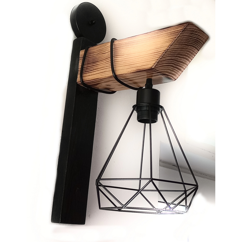 Aplica de perete din lemn de pin si metal, handmade, stil rustic–industrial
