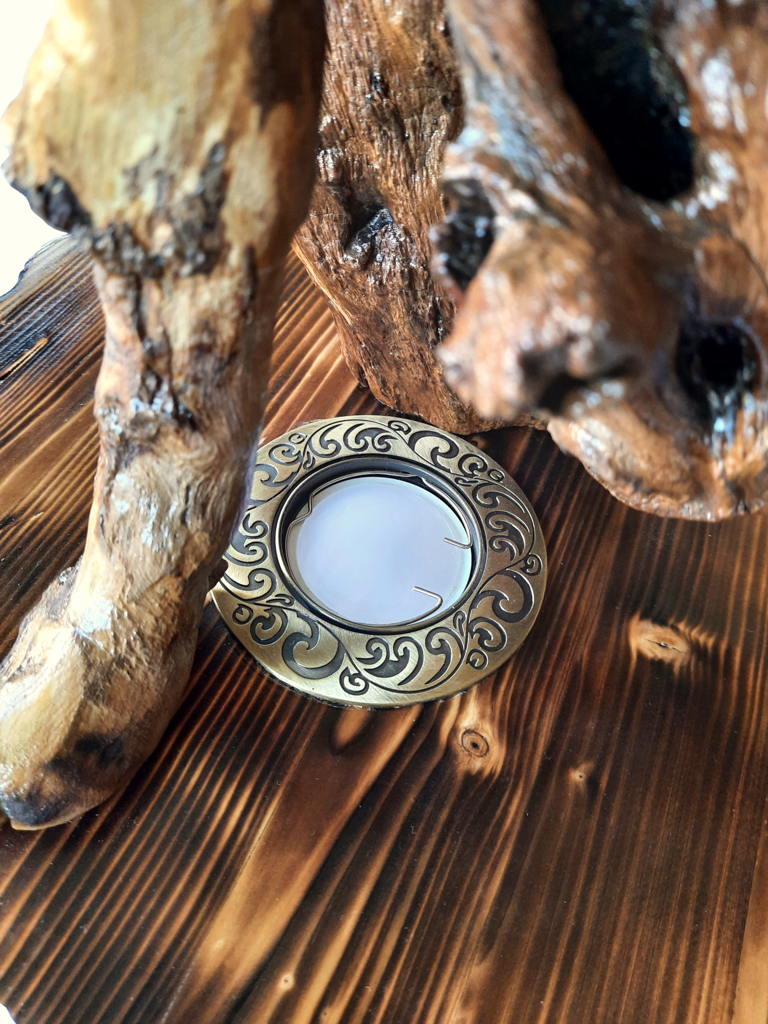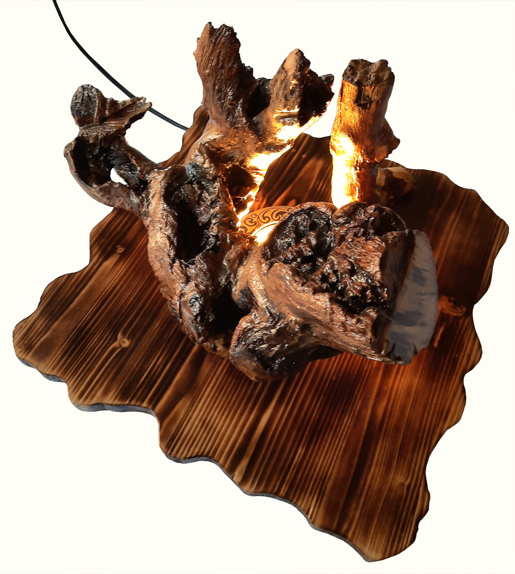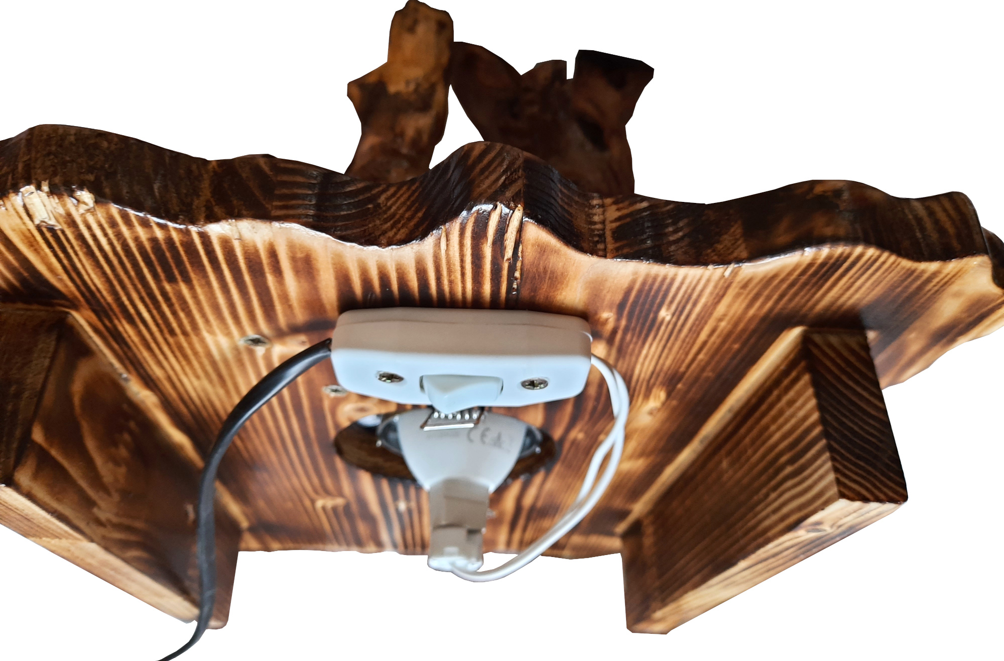 Decoratiunea este formata dintr-un suport, cu fibrele lemnului scoase in relief, pe care sunt aplicate doua bucati de lemn natural curatate si lacuite cu grija, pastrandu-i formele naturale.