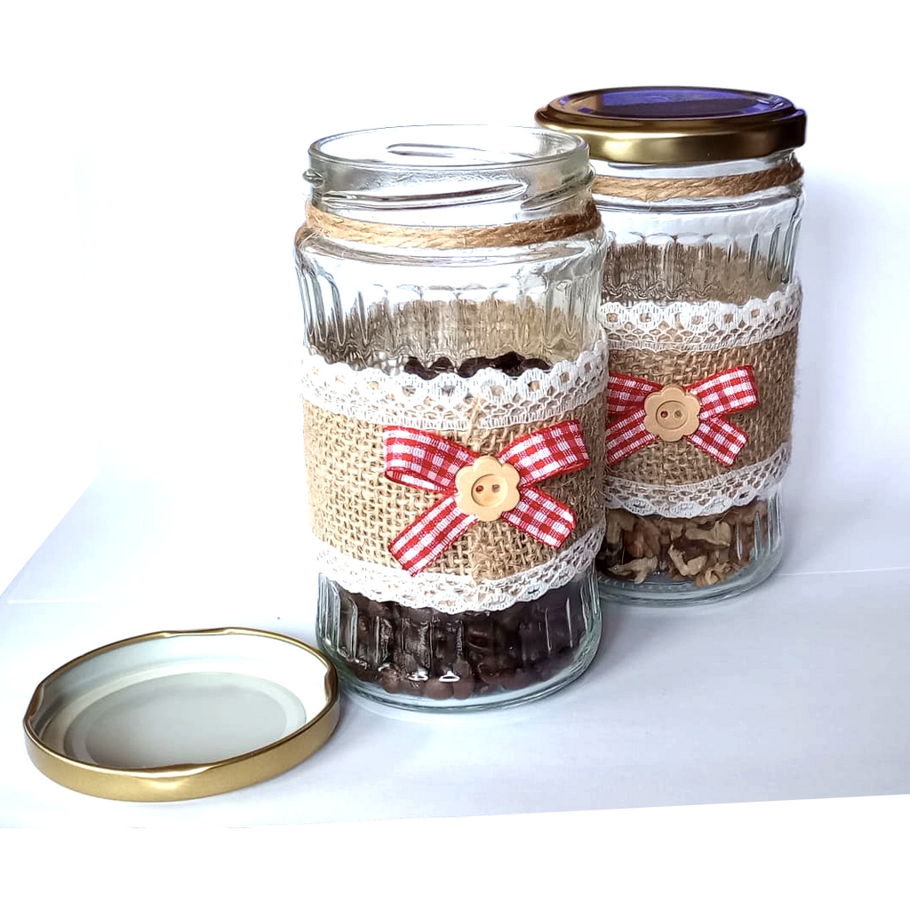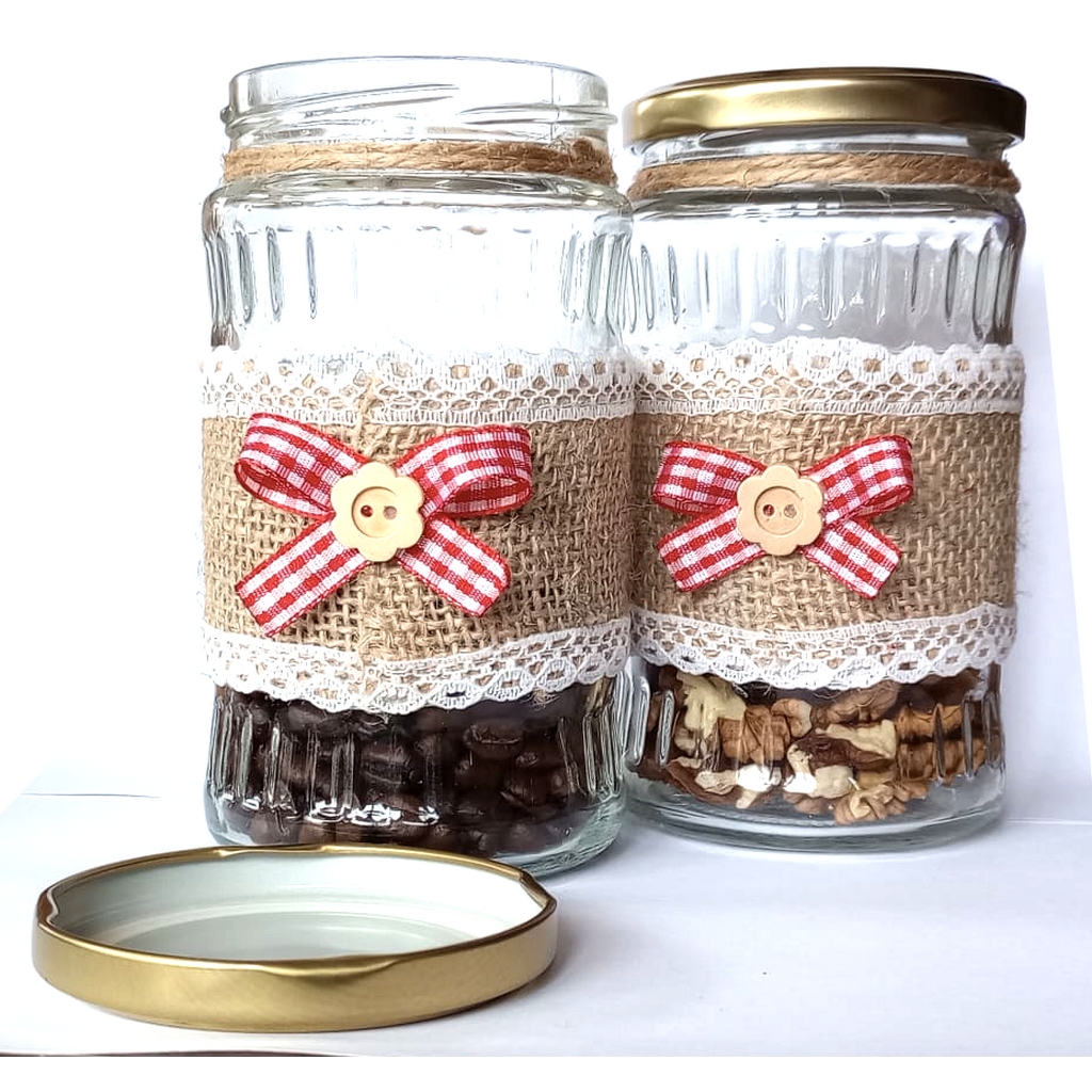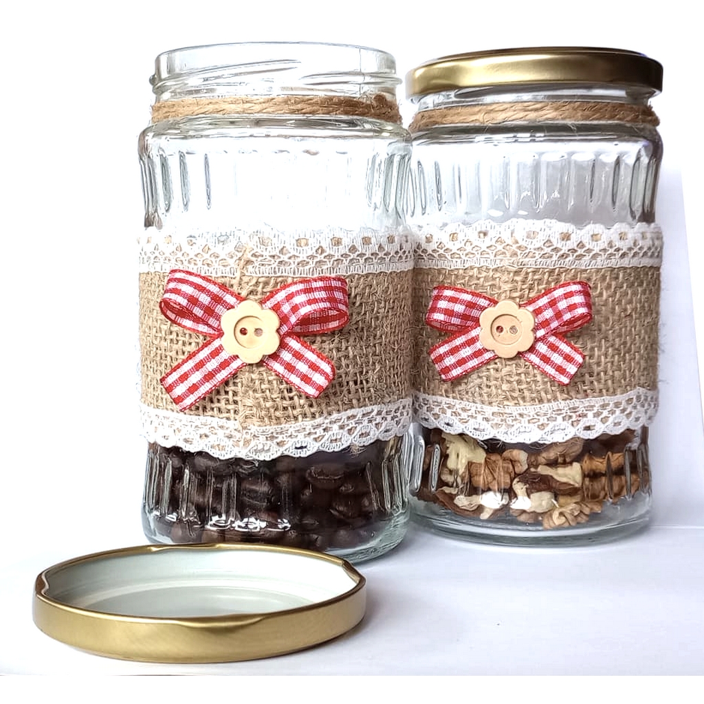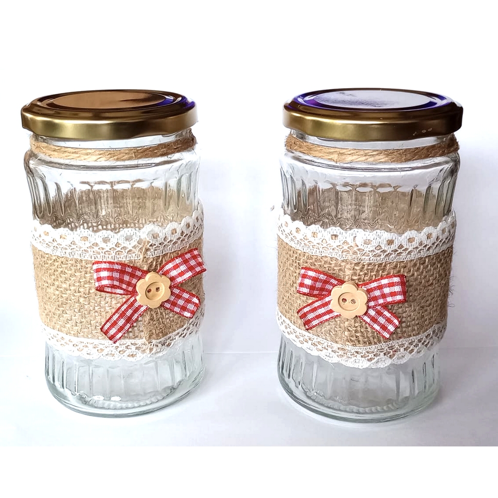 Etichete: Borcan decorat cu iuta panglica rosie si nasture din lemn