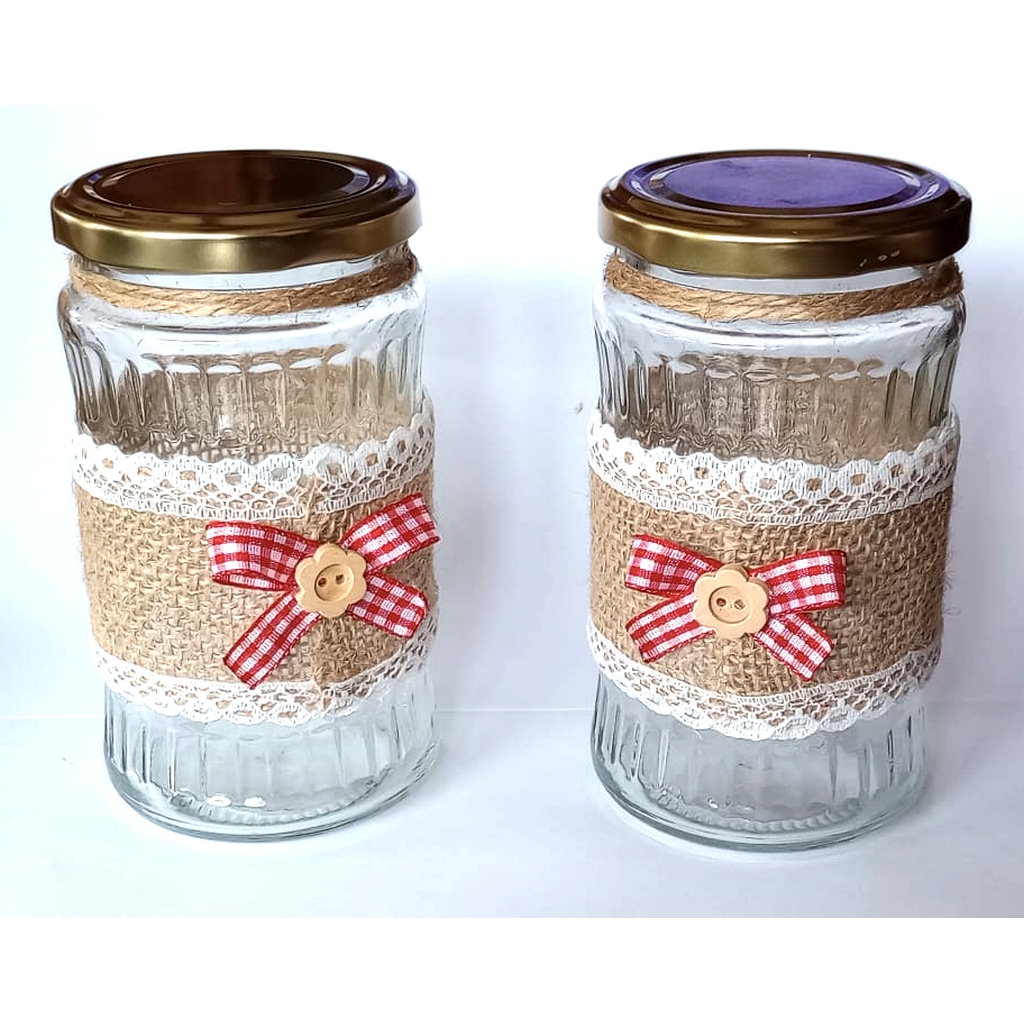 Borcan decorat cu iuta, panglica rosie si nasture din lemn