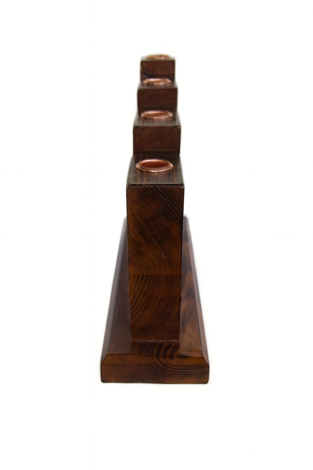 Acest suport decorativ pentru lumanari este realizat manual din lemn masiv, lucrat prin slefuire fina, ardere pentru evidentierea fibrei si lacuire in 2 straturi (lac stejar inchis + transparent). Piesa este solida, stabila si perfect finisata, ideala pentru decorul casei sau pentru un cadou special.