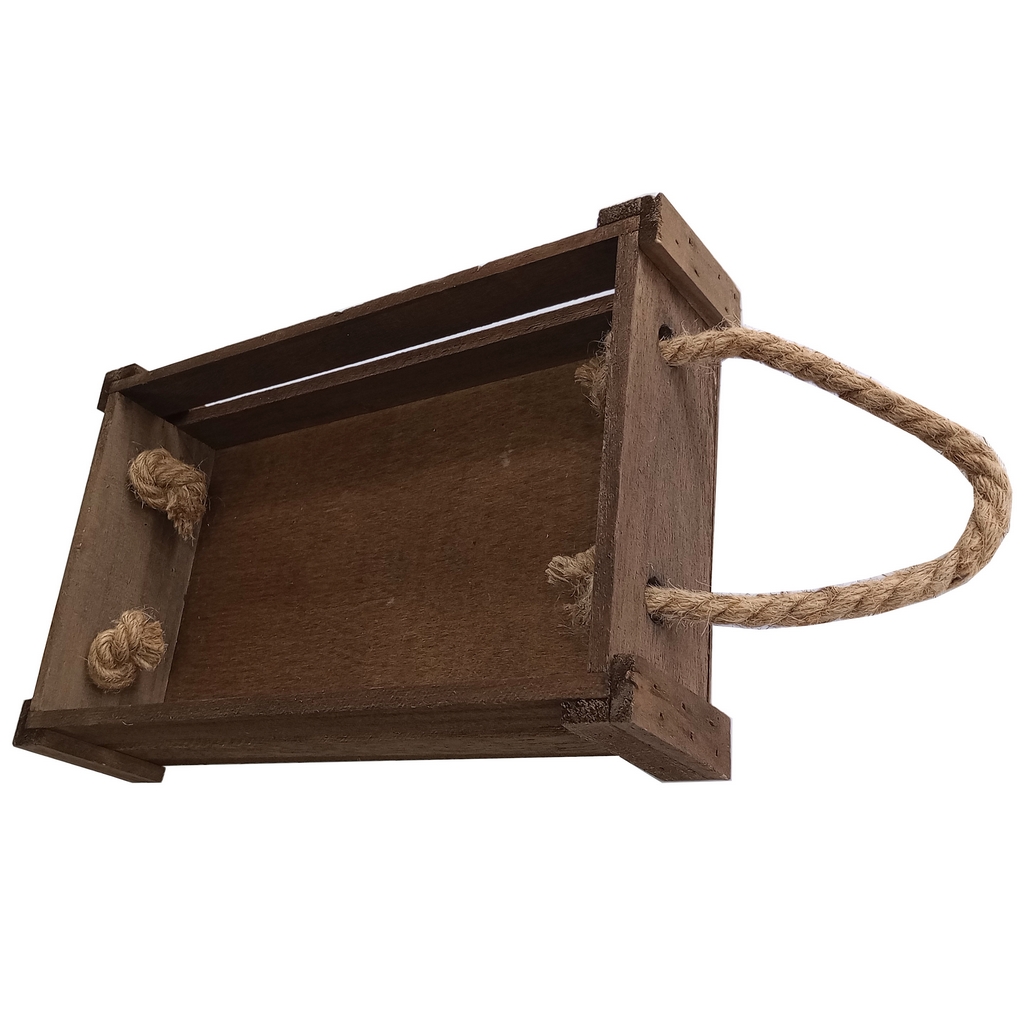 Lada din lemn maro inchis cu manere din franghie rasucita. Ideala pentru ambalarea si impachetarea cadourilor de Craciun, si nu numai, precum sticle sau dulciuri.
