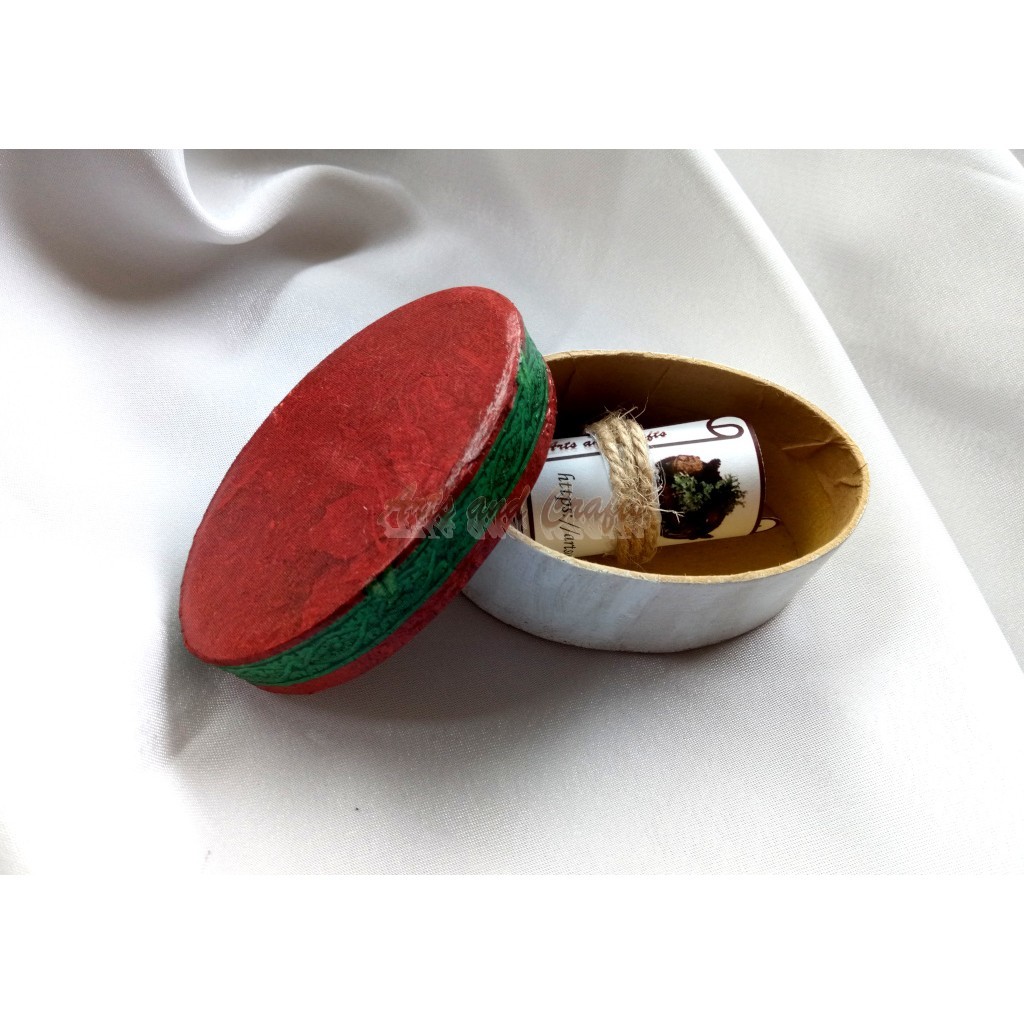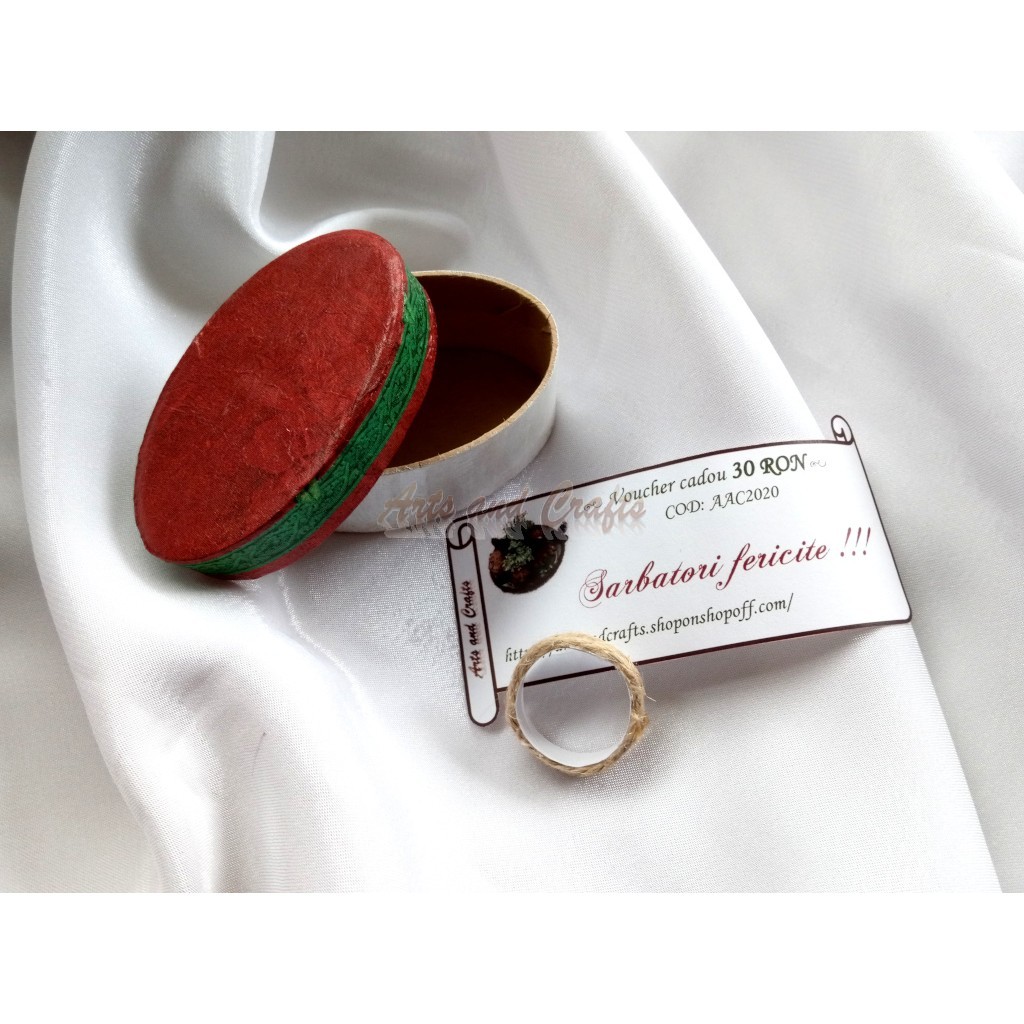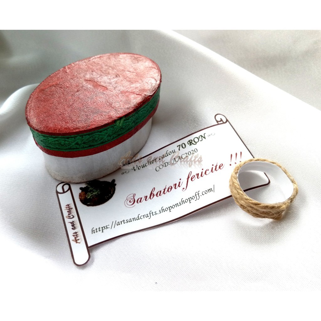 Voucher-ul este ambalat intr-o cutie mica, ovala, in culorile rosu-alb.
