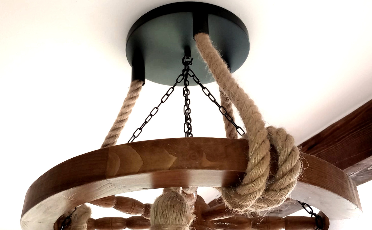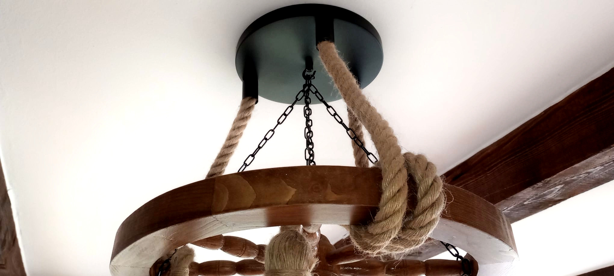 Etichete: Lustră rustică din lemn și funie – unicat, roată car
