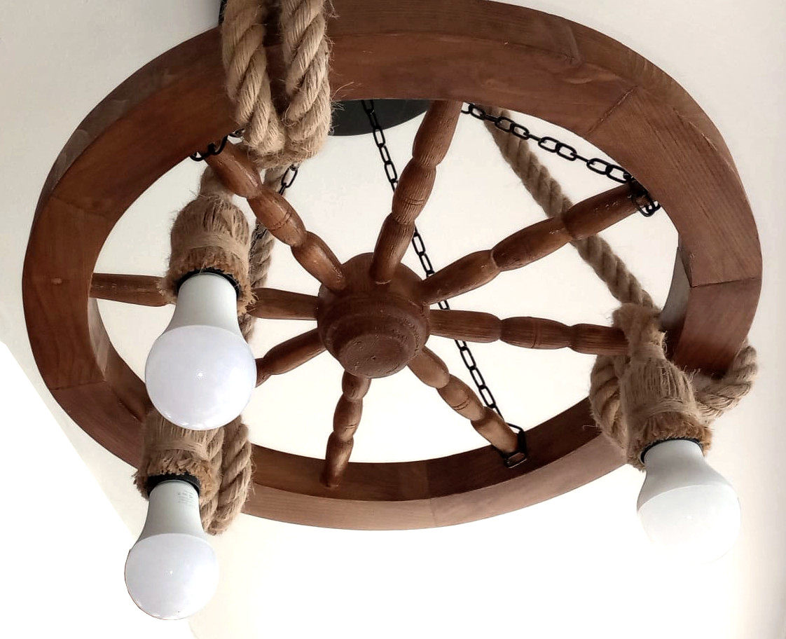 Lustră rustică din lemn și funie – unicat, roată car